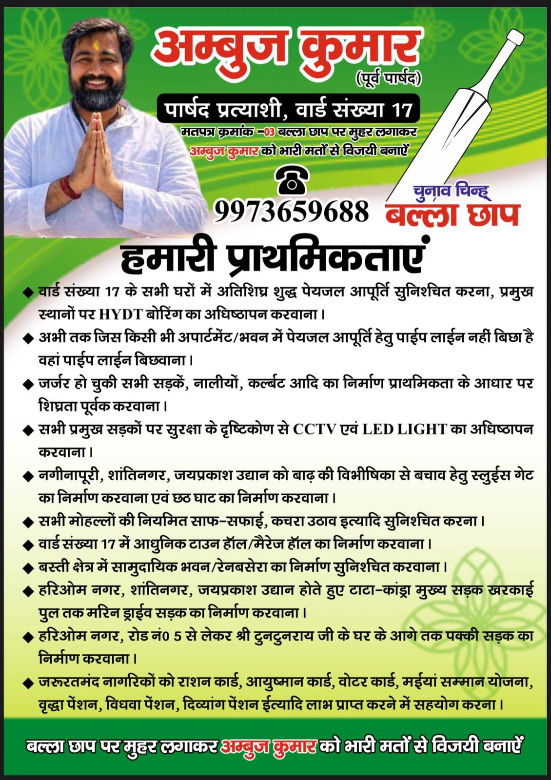 आदित्यपुर: आदित्यपुर नगर निगम चुनाव के मद्देनजर वार्ड संख्या 17 में सियासी हलचल तेज हो गई है। पूर्व पार्षद और इस बार के पार्षद प्रत्याशी अम्बुज कुमार ने औपचारिक रूप से अपनी प्राथमिकताओं का पिटारा खोलते हुए क्षेत्र के चहुंमुखी विकास का ब्लूप्रिंट जनता के सामने रखा है। ‘बल्ला छाप’ चुनाव चिह्न के साथ चुनावी समर में उतरे अम्बुज कुमार ने बुनियादी ढांचे से लेकर जन कल्याणकारी योजनाओं तक को अपने एजेंडे में शामिल किया है।