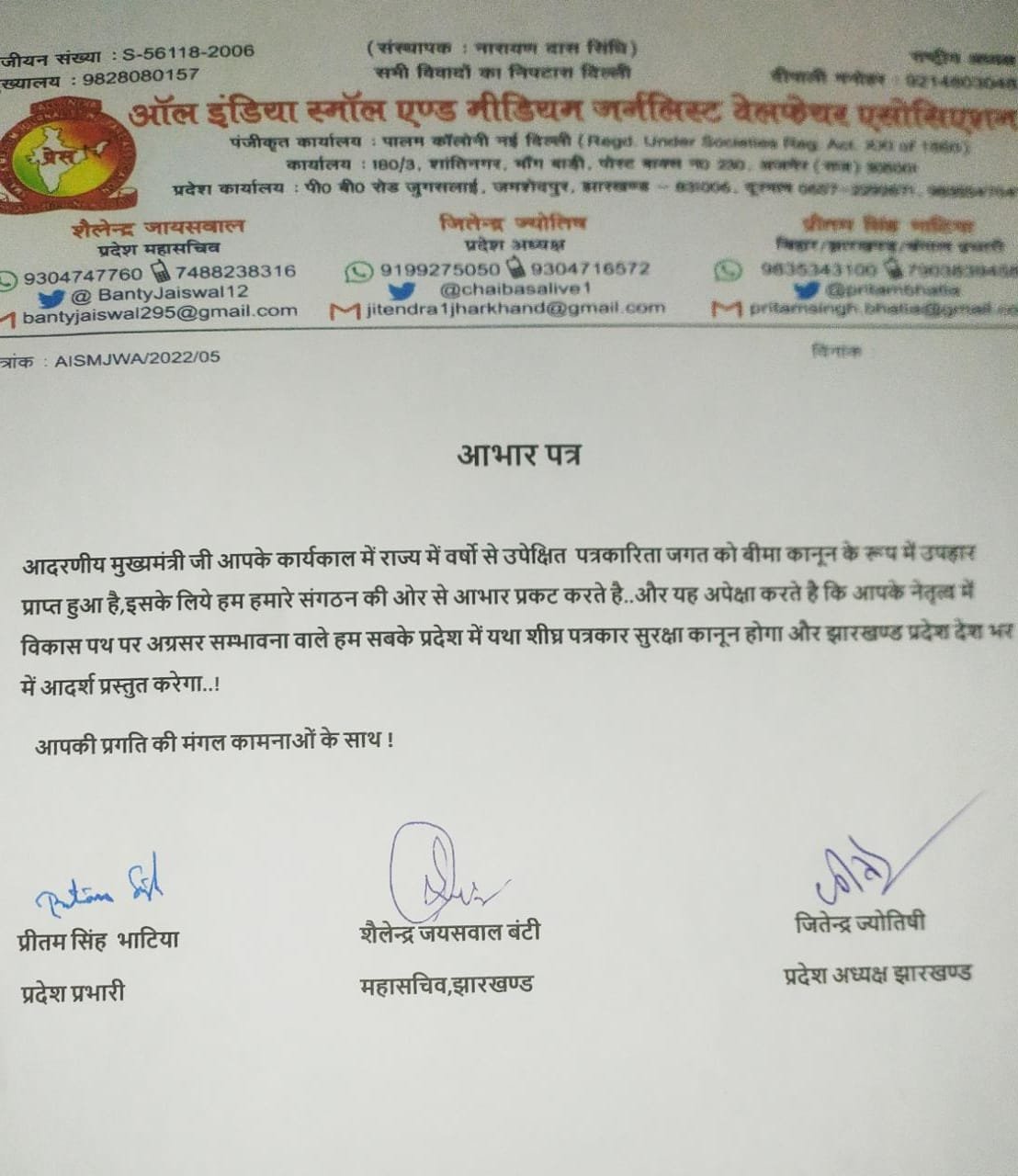 Ranchi :- ऑल इंडिया स्माॅल एंड मीडियम जर्नलिस्ट वेलफेयर एसोसिएशन (AISMJWA) के पदाधिकारियों ने मुख्यमंत्री को पत्रकार बीमा योजना के विधानसभा में पारित होने पर आभार पत्र सौंपा गया. इसके साथ ही आभार पत्र के साथ ही मुख्यमंत्री हेमंत सोरेन को प्रतीक चिन्ह भी दिया गया.