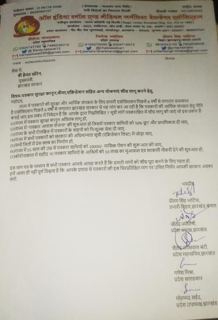 उपरोक्त जानकारी देते हुए एसोसिएशन के प्रदेश महासचिव शैलेंद्र जयसवाल बंटी ने बताया कि एसोसिएशन द्वारा मुख्यमंत्री को बीमा योजना के लिए आभार प्रकट किया गया है. उन्होने बताया कि AISMJWA के विभिन्न जिलों से 11 सदस्यीय प्रतिनिधिमंडल द्वारा प्रदेश प्रभारी प्रीतम भाटिया और प्रदेश अध्यक्ष जितेंद्र ज्योतिषी के नेतृत्व में मुख्यमंत्री को 7 सूत्री मांग पत्र सौंपा गया है. मांग पत्र में राज्य में पत्रकार सुरक्षा कानून, पेंशन, आवास, एक्रीडिटेशन, सभी जिलों में प्रेस क्लब का निर्माण,टोलब्रिज से पत्रकारों के वाहनों को निःशुल्क प्रवेश और कोरोनाकाल में 70 पत्रकार साथियों के आश्रितों को 10 लाख मुआवजा एवं सरकारी नौकरी की मांग की गई है.