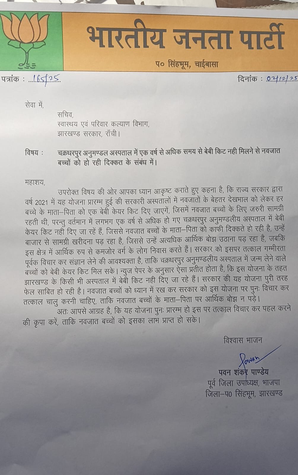 उन्होंने कहा कि चक्रधरपुर अस्पताल में पिछले एक वर्ष से किट वितरण पूरी तरह बंद है, जिसके कारण अभिभावकों को परेशानी और खर्च दोनों का सामना करना पड़ रहा है। उन्होंने यह भी उल्लेख किया कि मीडिया रिपोर्टों के अनुसार झारखंड के कई अस्पतालों में यह योजना ठप पड़ी हुई है, जिससे इसका उद्देश्य विफल होता दिख रहा है।