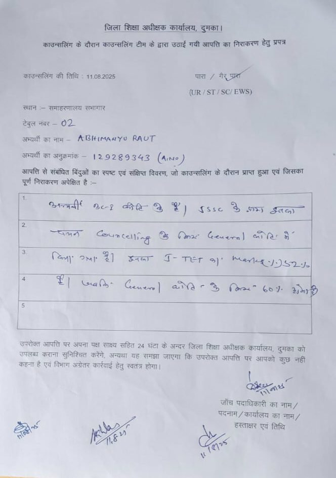 वर्ग छ से आठ विज्ञान गणित का डी वी हो चुका है।जिला स्तर पर काउंसलिंग जारी है. भारी संख्या में जे एस एस सी कार्यालय में डी वी के समय छंटनी हुई थी. अब जिला स्तर पर काउंसलिंग में भी छंटनी की संभावना को लेकर अभ्यर्थियों में छटपटाहट है. जिला स्तर पर एक बार फिर से 52और 60 का जिन्न निकल गया. दुमका जिला में चल रहे काउंसलिंग में एक अभ्यर्थी को नोटिस थमाया गया, जिसने जनरल कैटेगरी में 52% के साथ टेट पास पर 24 घंटे के भीतर जवाब तलब किया गया. इसके बाद ये नोटिस विभिन्न ग्रुपों में वायरल होता रहा. रात भर अभ्यर्थियों की छटपटाहट बनी रही.