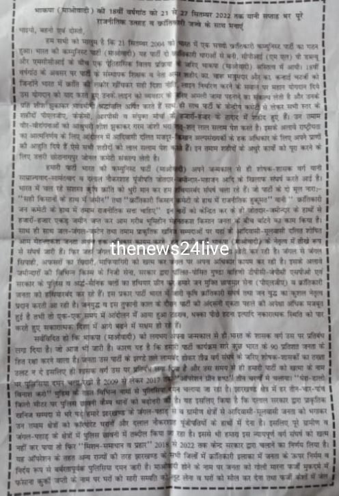 पोस्टर में लिखा गया है कि 21 सितंबर से 27 सितंबर तक पार्टी का 18 वीं वर्षगांठ जोश के साथ मनाने और सफल करने को लेकर भाकपा माओवादियों ने अपील की है कि 21 से 27 सितंबर तक पूरे राजनीतिक उत्साह और क्रांतिकारी जज्बे के साथ मनाने का आह्वान किया है. माओवादियों द्वारा जारी पोस्टर में बताया गया है कि पार्टी के खात्मा के नाम पर पुलिसिया दमन चला रखी है. 2009 से 2017 तक ऑपरेशन ग्रीन हंट तीन चरणों में चलाया, घेरा डालो विनाश करो मुहिम के तहत विभिन्न नामों से पुलिसिया दमन चलाया जा रहा है. झारखंड क्षेत्र में प्रत्येक तीन चार पांच किलोमीटर पर पुलिस छावनी के स्थानों की बढ़ोतरी की है. सरकार द्वारा प्राकृतिक खनिज संपदा से भरे झारखंड के जंगल पहाड़ से ग्रामीण क्षेत्रों से आदिवासी मूलवासी जनता को भगाकर उन तमाम क्षेत्रों को कारपोरेट घरानों, पूंजीपतियों, नौकरशाहों को देना है. इसलिए पूरे ग्रामीण और जंगल पहाड़ के क्षेत्रों में पुलिस छावनी में तब्दील किया जा रहा है. 2018 से 2022 तक मिशन समाधान और प्रहार शुरू किया गया है.