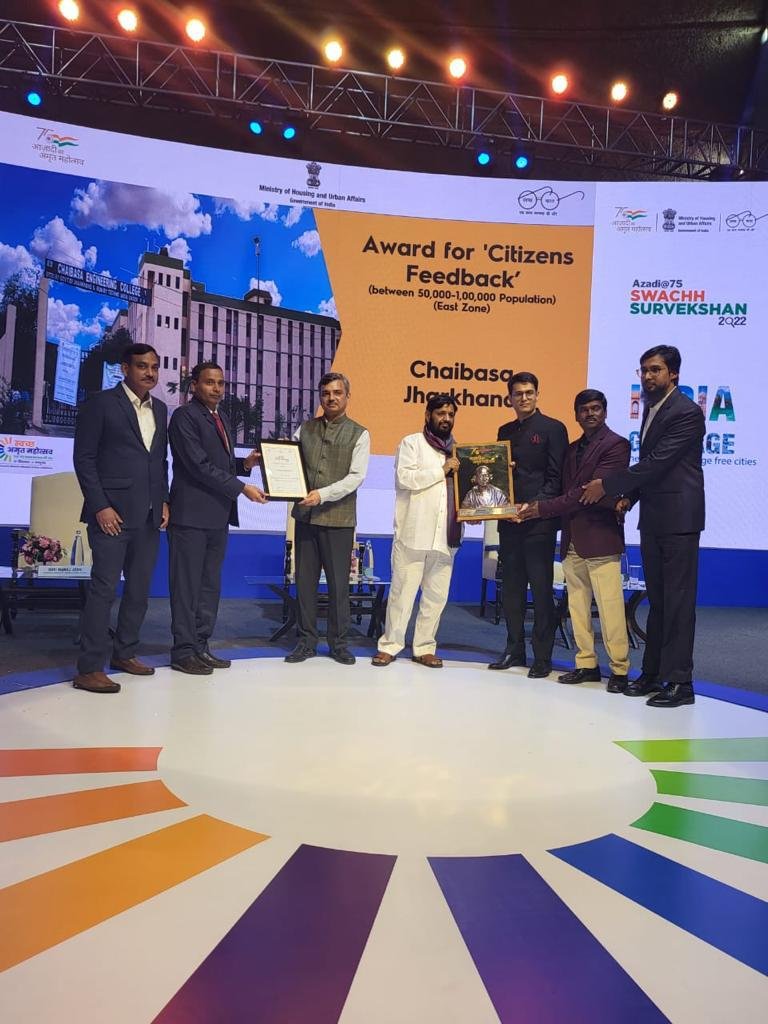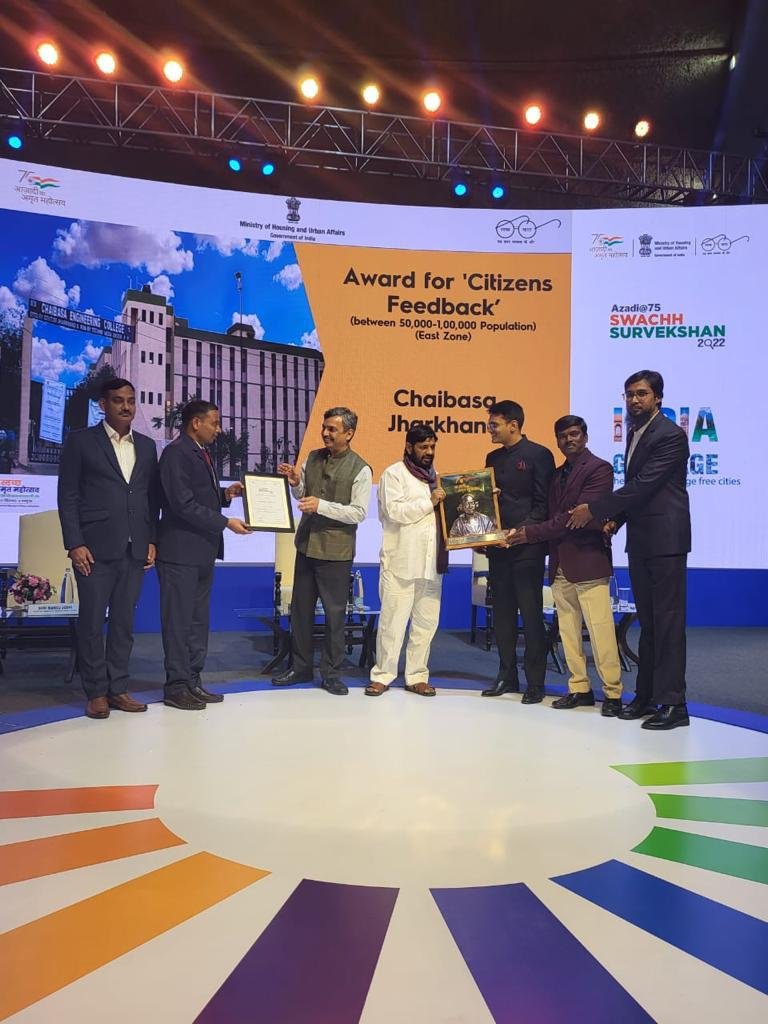 Chaibasa:- केंद्रीय आवास एवं शहरी कार्य मंत्रालय भारत सरकार की ओर से संचालित आजादी @75 स्वच्छ सर्वेक्षण-2022 में बेहतर प्रदर्शन करने के लिए नई दिल्ली में आयोजित समारोह के दौरान पश्चिमी सिंहभूम जिला मुख्यालय शहर चाईबासा नगरपरिषद को बेस्ट सिटी इन सिटीजन फीडबैक इन ईस्ट जोन कैटेगरी (50 हजार-1 लाख जनसंख्या) में पुरस्कृत किया गया. जिसे जिला दंडाधिकारी-सह-उपायुक्त अनन्य मित्तल, डोमा मिंज़, कार्यकारी अध्यक्ष, सतेंदर महतो कार्यपालक पदाधिकारी, ज्योति पुंज नगर प्रबंधक ने कौशल किशोर, शहरी कार्य मंत्रालय के राज्य मंत्री के द्वारा समारोह में पुरस्कार प्राप्त किया गया.