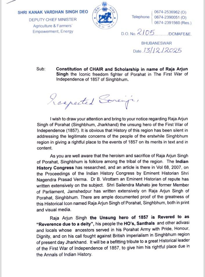 भुवनेश्वर/रांची। उड़ीसा (ओडिशा) के उपमुख्यमंत्री कनक वर्धन सिंह देव ने झारखंड के मुख्यमंत्री हेमंत सोरेन को एक औपचारिक पत्र लिखकर पश्चिमी सिंहभूम के पोड़ाहाट के प्रतिष्ठित स्वतंत्रता सेनानी राजा अर्जुन सिंह के नाम पर एक अध्यासन (Chair) और छात्रवृत्ति (Scholarship) स्थापित करने की मांग की है। यह प्रस्ताव झारखंड के कोल्हान विश्वविद्यालय, चाईबासा में स्थापना से संबंधित है।