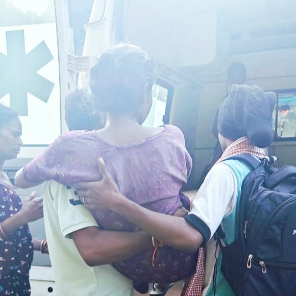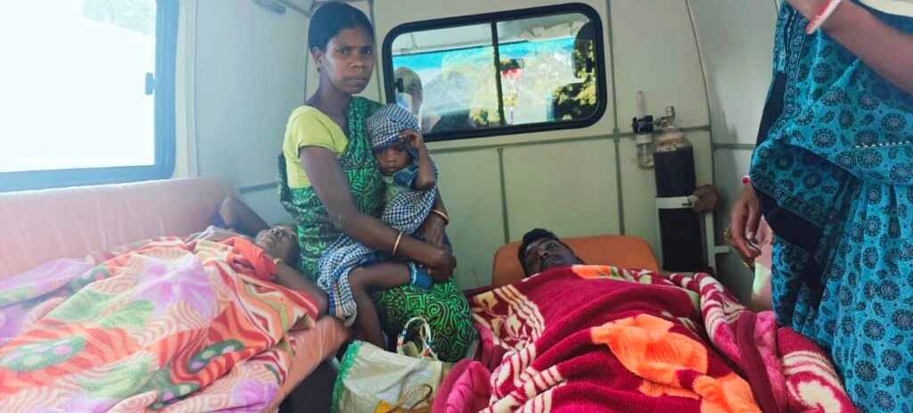 डायरिया पीड़ित रोगी को एम्बुलेंस से अस्पताल ले जाते ग्रामीण