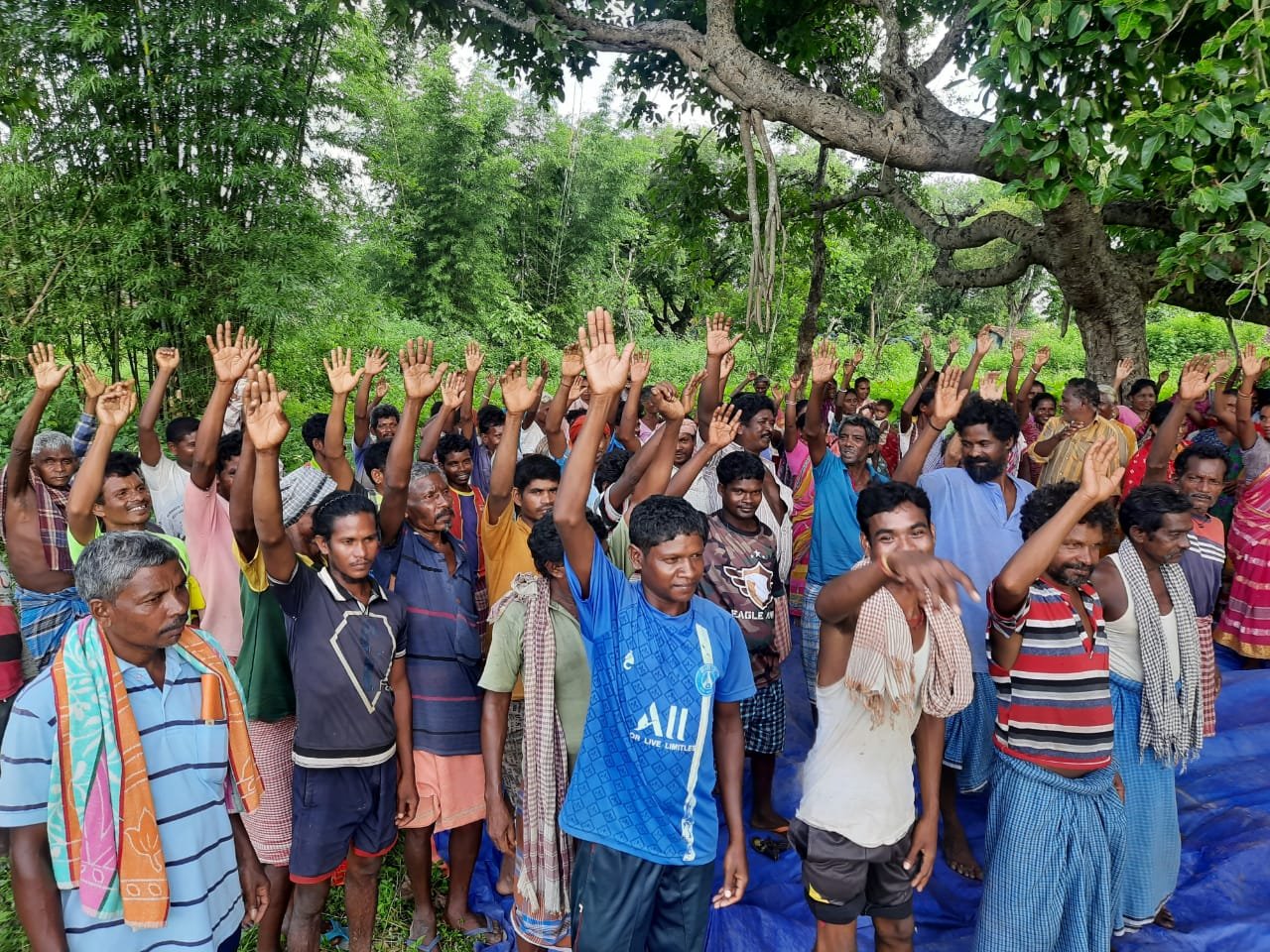 ग्राम सभा में हाथ उठा कर समर्थन करते ग्रामीण
