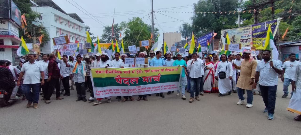 Chaibasa (चाईबासा) : लगभग 15-16 दिन पूर्व चाईबासा के रोमन कैथोलिक चर्च में ‘हो’ समाज का हेरोः पर्व मनाने के विरोध में ‘हो’ समाज के दियुरीगण तथा मानकी-मुण्डा के नेतृत्व में आदिवासी ‘हो’ समाज महासभा के सभी अनुषंगी ईकाई के पदाधिकारियों ने चाईबासा शहर में पैदल मार्च निकाली. विरोध मार्च में बैनर-पोस्टर के साथ लगभग 300 लोग शामिल हुए.