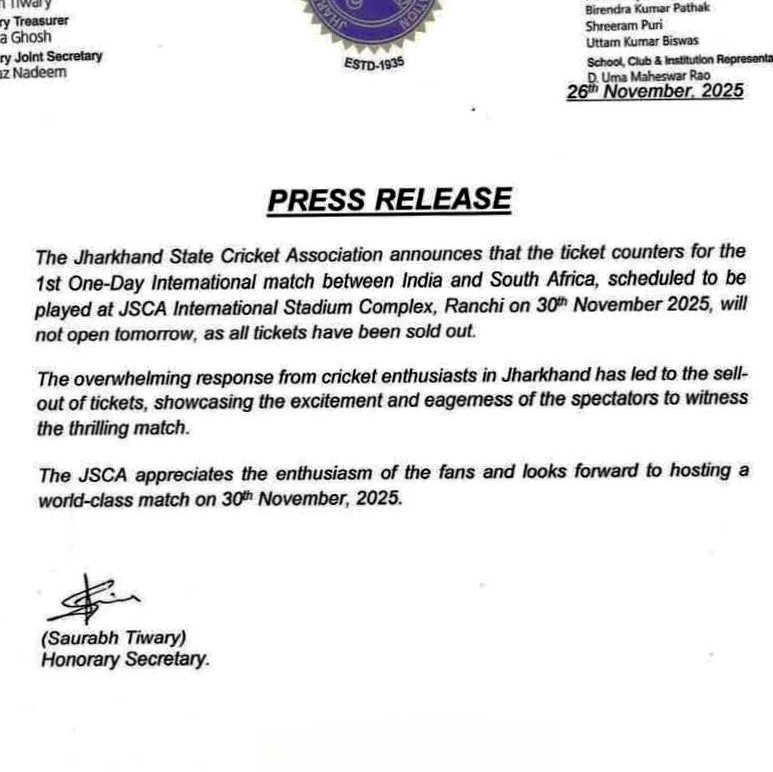Ranchi (रांची) : 30 नवंबर को JSCA इंटरनेशनल स्टेडियम में भारत और दक्षिण अफ्रीका के बीच होने वाले वनडे मुकाबले का रोमांच मैच से पहले ही चरम पर पहुँच गया है। मैच के लिए जारी सभी टिकट पूरी तरह बिक चुके हैं और अब स्टेडियम प्रबंधन ने टिकट बिक्री काउंटर बंद कर दिए हैं। टिकट काउंटर बंद होने की आधिकारिक पुष्टि के बाद स्पष्ट हो गया है कि अब कोई अतिरिक्त टिकट उपलब्ध नहीं होगा।