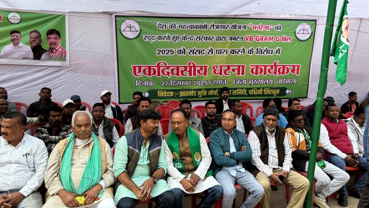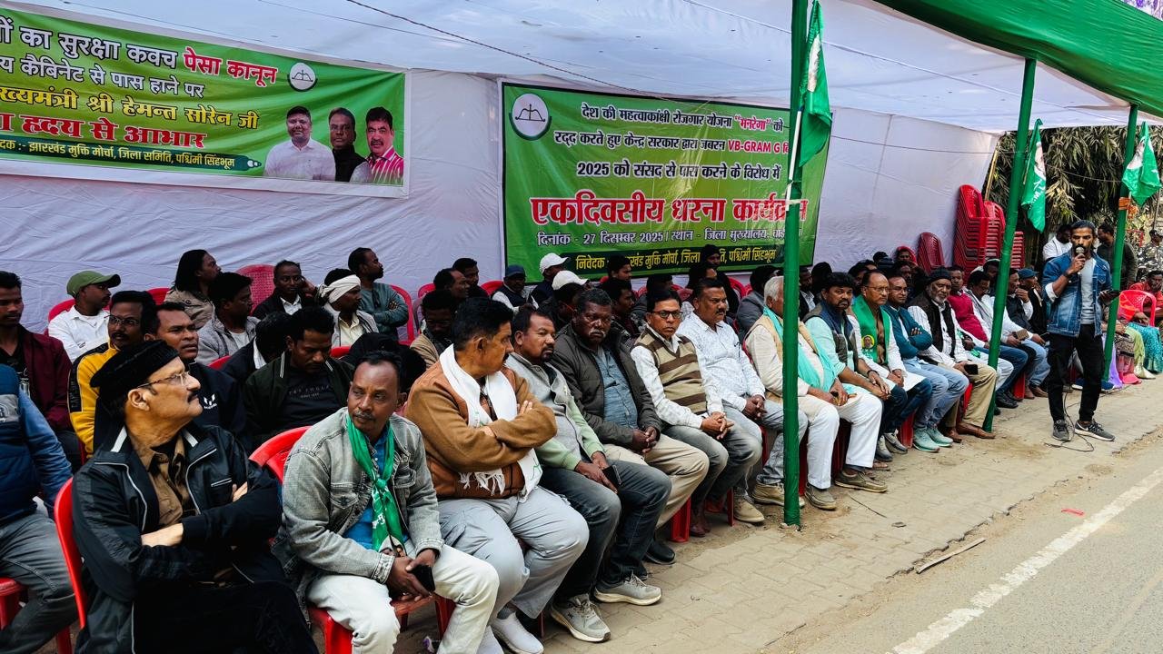 चाईबासा (पश्चिमी सिंहभूम): भारतीय जनता पार्टी के नेतृत्व वाली केन्द्र सरकार द्वारा देश की महत्वाकांक्षी रोजगार योजना महात्मा गांधी राष्ट्रीय ग्रामीण रोजगार गारंटी अधिनियम (मनरेगा) को समाप्त करने के निर्णय के खिलाफ झारखंड मुक्ति मोर्चा ने चाईबासा स्थित एसडीओ कार्यालय के बाहर धरना प्रदर्शन कर कड़ा विरोध दर्ज कराया है। झामुमो ने इस फैसले को गरीब, मजदूर, आदिवासी, मूलवासी और अल्पसंख्यक विरोधी करार दिया है।