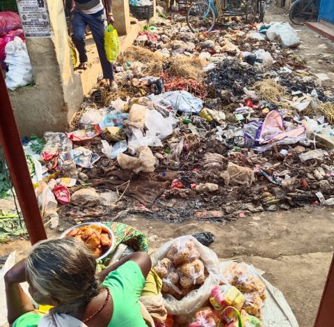 खुले कचरे के पहाड़, जैविक और प्लास्टिक कचरे का अंबार और उन्हीं के बीच बैठा गरीब आदिवासी विक्रेता।