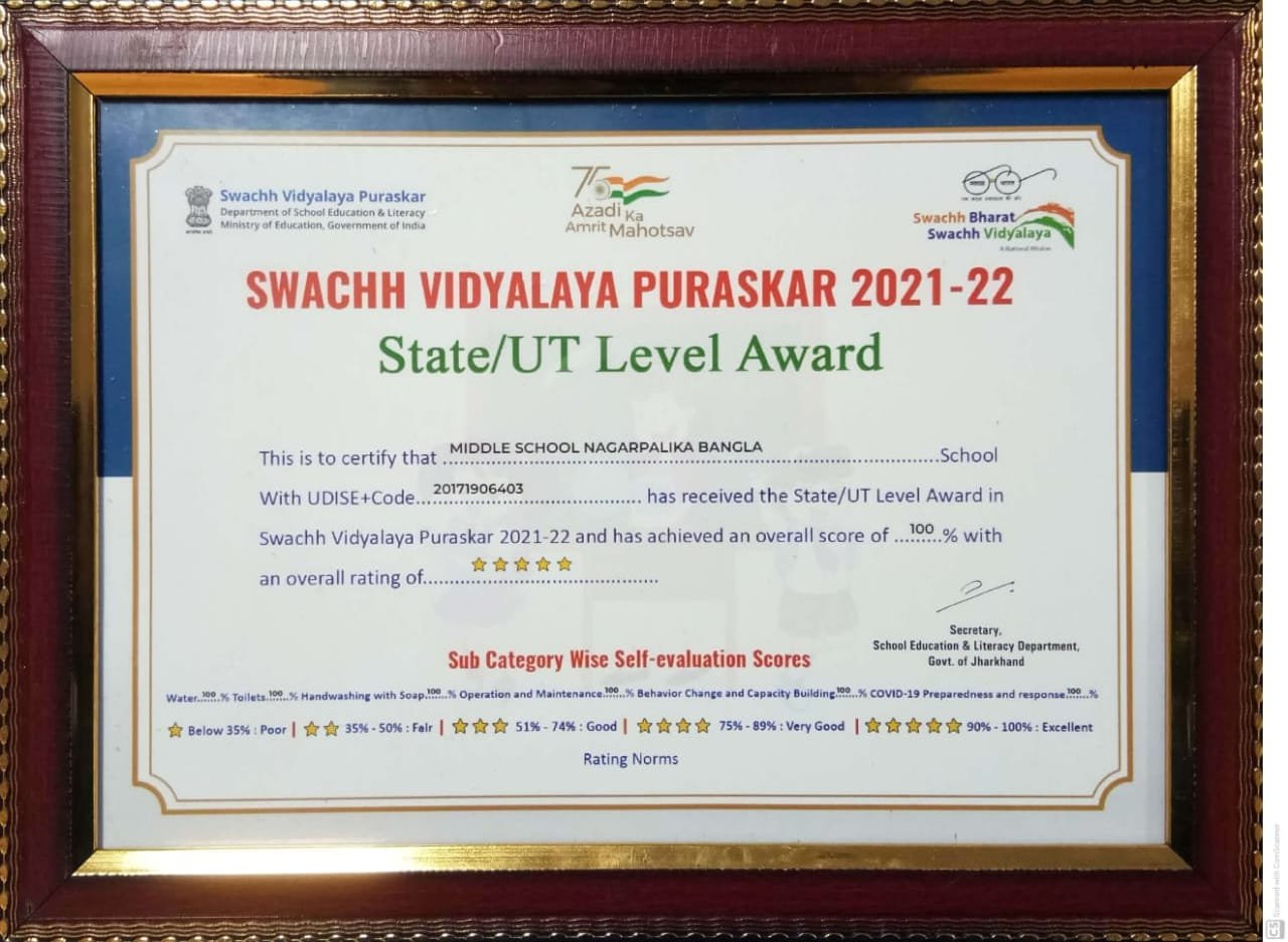 Chaibasa:- चाईबासा के नगरपालिका क्षेत्र में अवस्थित आदर्श नगरपालिका बंगला मध्य विद्यालय को शैक्षणिक सत्र 2021-22 के लिए ओवर आल कैटेगरी में राज्य स्तरीय स्वच्छ विद्यालय पुरस्कार से नवाजा गया। पश्चिमी सिंहभूम के ही कस्तुरबा गांधी बालिका विद्यालय नोवामुंडी को ओवर आल कैटेगरी में तथा आदर्श मध्य विद्यालय बड़ाजामदा को व्यवहार परिवर्तन की सब कैटेगरी में राज्य स्तरीय पुरस्कार प्राप्त हुआ है।