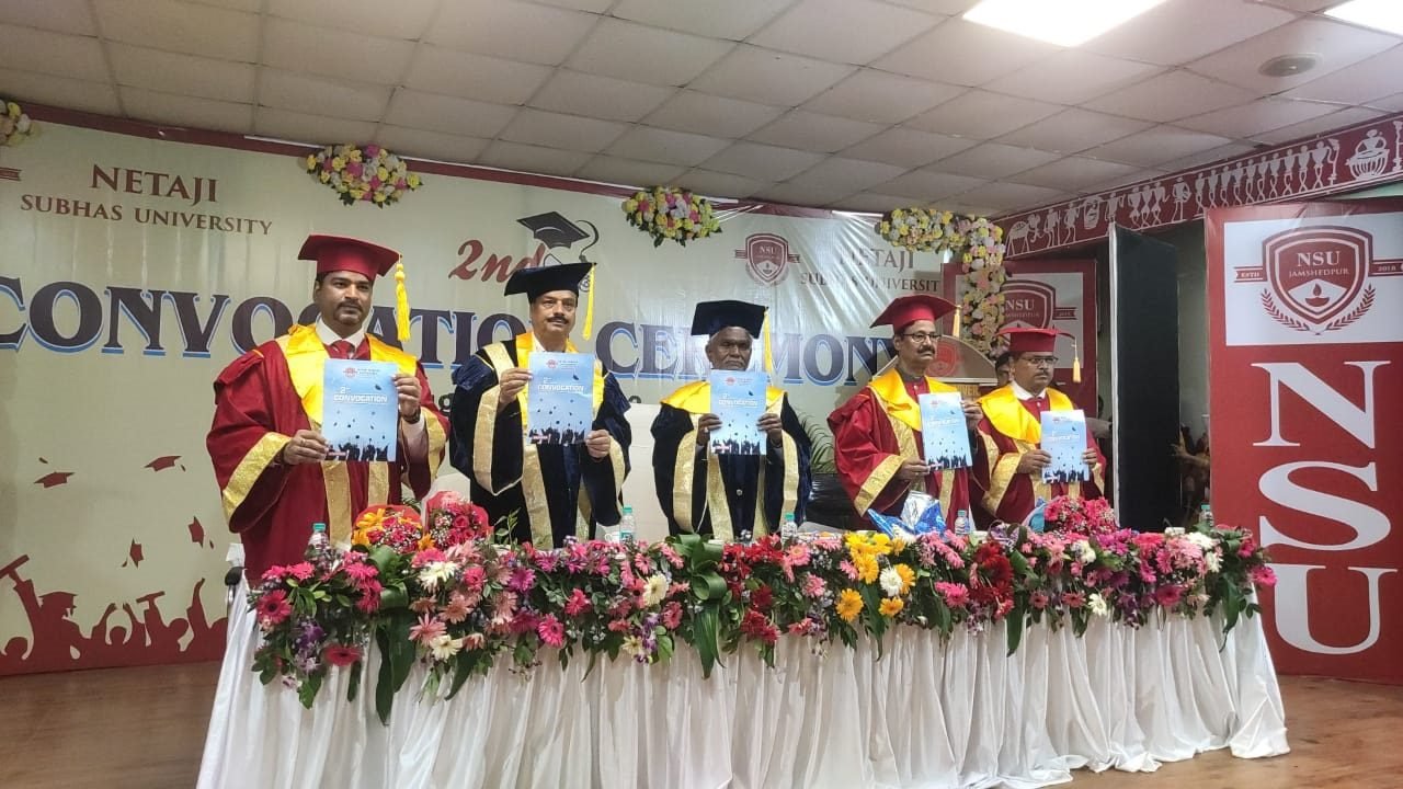 Jamshedpur : जमशेदपुर स्थित नेताजी सुभाष यूनिवर्सिटी में रविवार को द्वितीय दीक्षांत समारोह का आयोजन किया गया. समारोह के मुख्य अतिथि राज्य के पथ परिवहन एवं अनुसूचित जाति, अनुसूचित जनजाति कल्याण मंत्री चंपई सोरेन थे. आरंभ में शैक्षणिक जुलूस के साथ मुख्य अतिथि श्री सोरेन को मंच तक लाया गया. तत्पश्चात समारोह की शुरुआत हुई. समारोह में स्नातक 2019-22 तथा स्नातकोत्तर 2019-22 के करीब 400 छात्र-छात्राएं एवं उनके अभिभावक शामिल हुए. इनमें से विभिन्न पाठ्यक्रम के टॉपर व सेकेंड टॉपर रहे 21 छात्र-छात्राओं को गोल्ड तथा 16 छात्र-छात्राओं को सिल्वर मेडल व डिग्री प्रदान कर सम्मानित किया गया. समारोह में यूनिवर्सिटी के कुलाधिपति मदन मोहन सिंह ने मंत्री चंपई सोरेन को डॉक्टरेट की मानद उपाधि देने की घोषणा की.