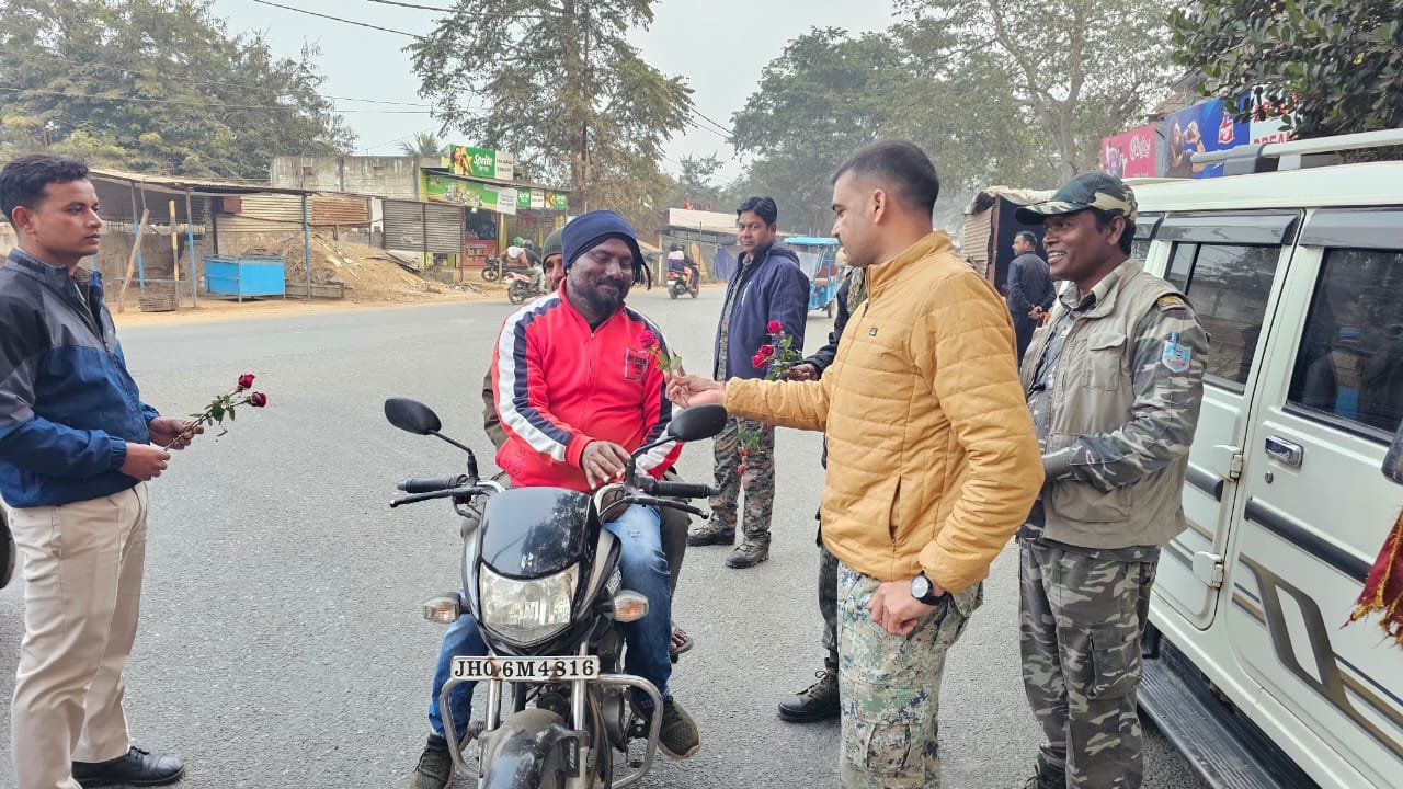 चाईबासा में ‘गांधीगिरी’ से सड़क सुरक्षा का आगाज़, ट्रैफिक नियम तोड़ने वालों को दिया गया गुलाब और पहनाई गई माला