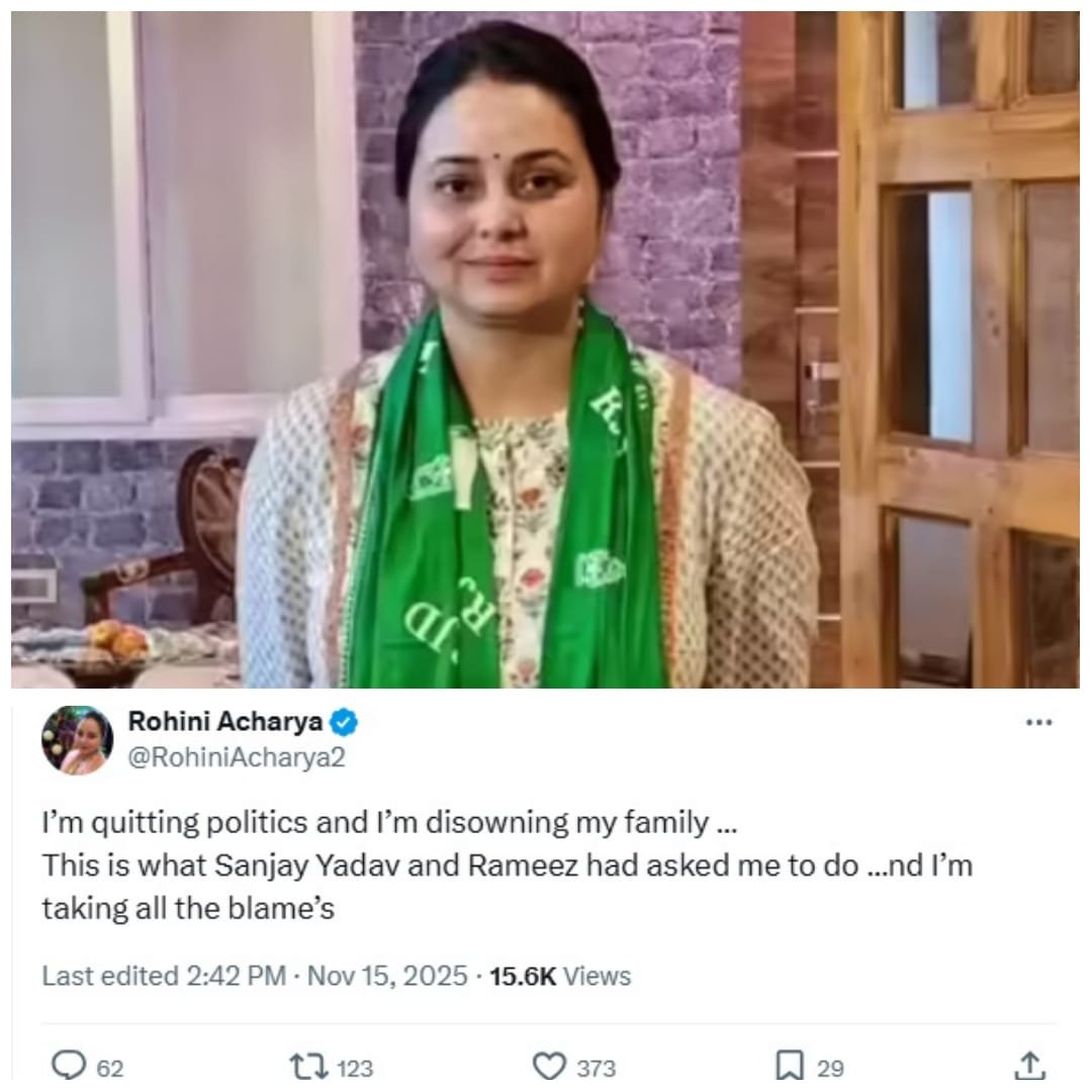 Patna (पटना) : राजद सुप्रीमो लालू प्रसाद यादव की बेटी रोहिणी आचार्य ने शुक्रवार को सोशल मीडिया पर एक चौंकाने वाला बयान जारी करते हुए राजनीति और परिवार—दोनों से दूरी बनाने का ऐलान कर दिया। उनके इस फैसले ने बिहार की राजनीतिक हलचल को अचानक तेज कर दिया है।