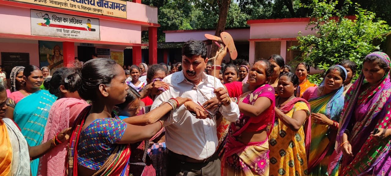 Gua:- पश्चिमी सिंहभूम जिले के बड़ाजामदा बस्ती के राजकीय उत्क्रमित मध्य विद्यालय खासजामदा के शिक्षक प्रेम कुमार पोद्दार के द्वारा स्कूल के ही छात्रों को अश्लील वीडियो दिखाकर उसके साथ यौन शोषण करने के आरोप में महिलाओं ने बड़ाजामदा बस्ती में एक बैठक कर आरोपी शिक्षक प्रेम कुमार पोद्दार को स्कूल से निकालकर उसे जूतों का माला तथा मुंह में कालिख पोतकर पूरा बस्ती घुमाया गया।