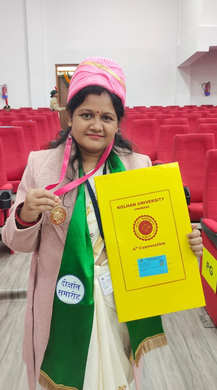 Chaibasa (चाईबासा) : कोल्हान विश्वविद्यालय द्वारा आयोजित छठवें दीक्षांत समारोह में विभिन्न विभागों के टॉपर छात्रों एवं पीएचडी उपाधि धारकों को महामहिम राज्यपाल सह कुलाधिपति के कर-कमलों द्वारा सम्मानित किया गया। इसी क्रम में टाटा कॉलेज चाईबासा के दर्शनशास्त्र विभाग की गोल्ड मेडलिस्ट टॉपर श्रीमती लक्ष्मी गोप (पत्नी—पूर्व सचिव, टाटा कॉलेज छात्र संघ मुकेश गोप) को राज्यपाल महोदय ने सम्मानित किया।