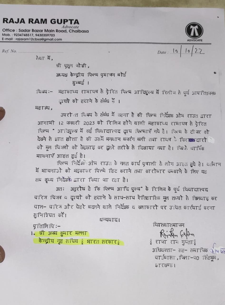 Chaibasa :- महाकाव्य रामायण से प्रेरित फिल्म “आदिपुरुष” में रिलीज से पूर्व आपत्तिजनक दृश्यों को हटाने को लेकर चाईबासा के अधिवक्ता सह सामाजिक कार्यकर्ता राजाराम गुप्ता ने केंद्रीय फिल्म प्रमाणन बोर्ड के अध्यक्ष प्रसून जोशी एवं केंद्रीय गृह सचिव अजय कुमार भल्ला (भारत सरकार) को पत्र लिखा है.