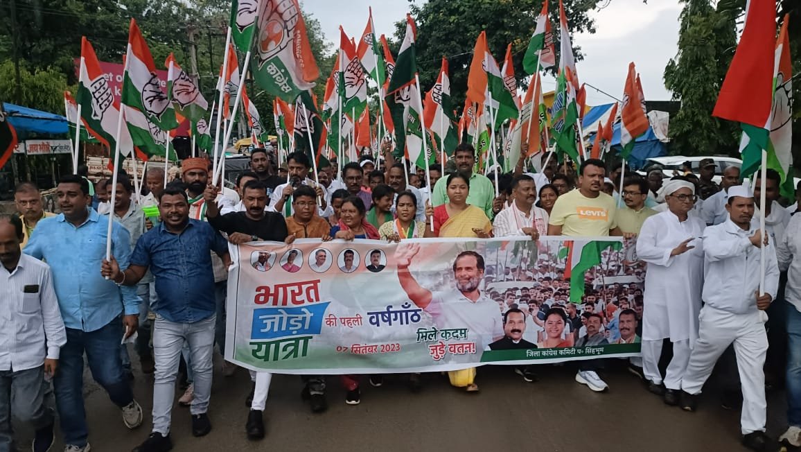 Chaibasa :- ऐतिहासिक भारत जोड़ो यात्रा की पहली वर्षगांठ मनाने के लिए झारखंड प्रदेश कांग्रेस कमिटी के अध्यक्ष राजेश ठाकुर के निर्देशानुसार भारत जोड़ो यात्रा के पहले वर्षगांठ पर गुरुवार को पश्चिमी सिंहभूम जिला मुख्यालय कांग्रेस भवन चाईबासा से शहीद पार्क रुंगटा चौक, कोर्ट परिसर होते हुए घंटाघर से पोस्ट ऑफिस चौक होते हुए वापस कांग्रेस भवन में भारत जोड़ो पदयात्रा का आयोजित किया गया.