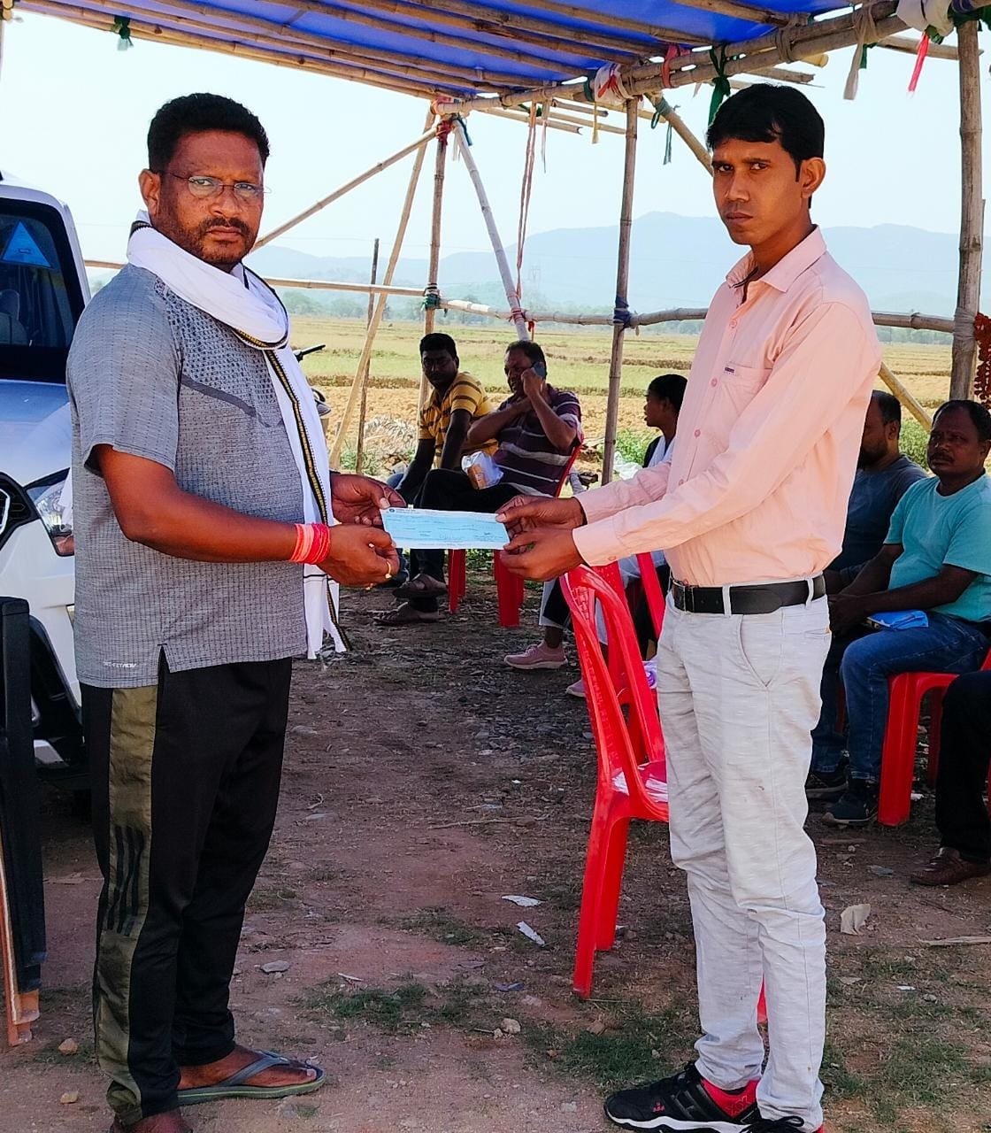 लखींद्र प्रधान को एक लाख रुपये का चेक सौंपते विधायक दशरथ गागराई